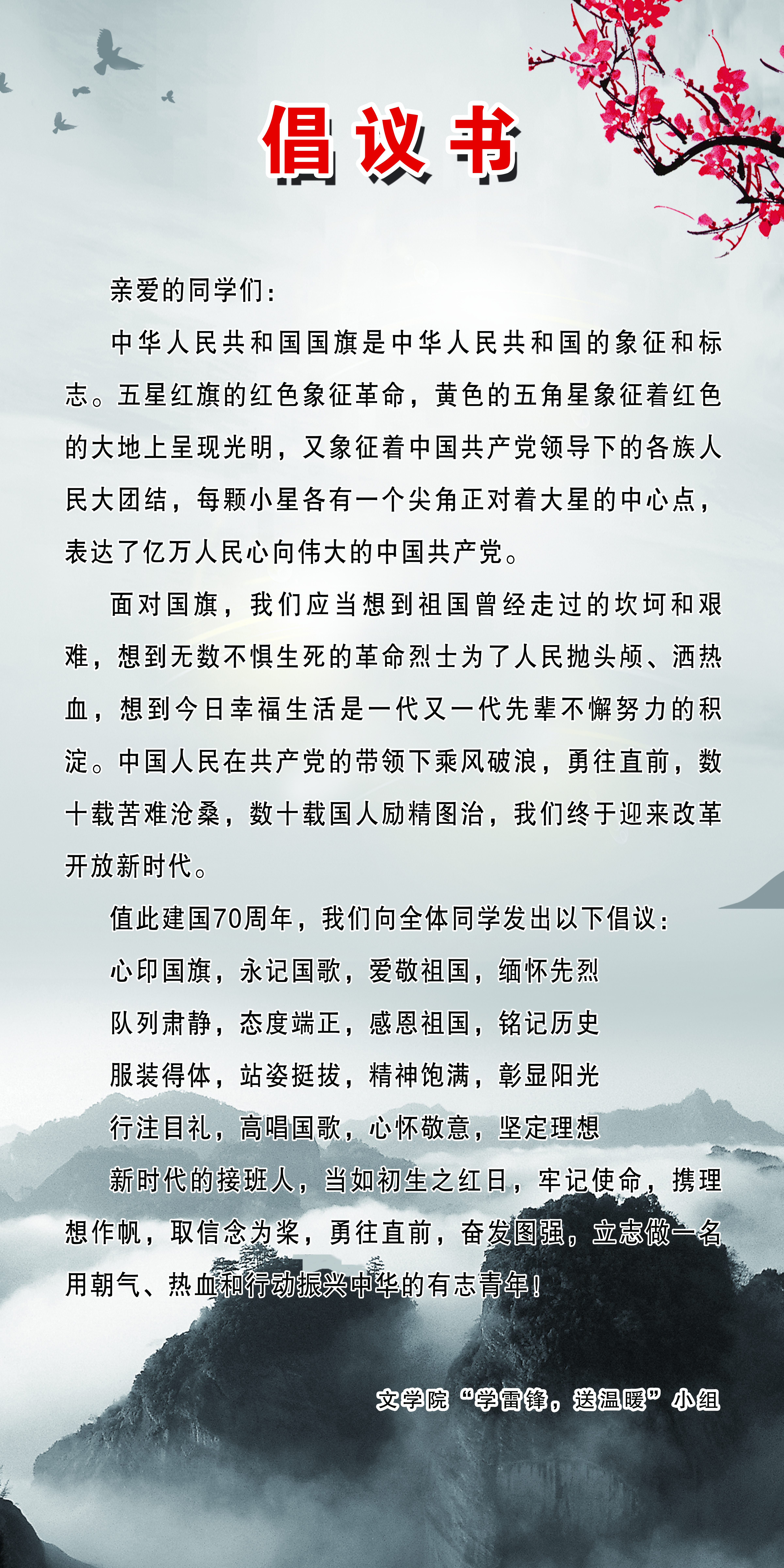 随后,“学雷锋,送温暖”小组向同学们发出了关于规范升旗仪态倡议书,制作了倡议宣传海报,号召同学们端正升旗态度,牢记老一辈革命者的付出与努力,牢记作为新时代接班人的使命。