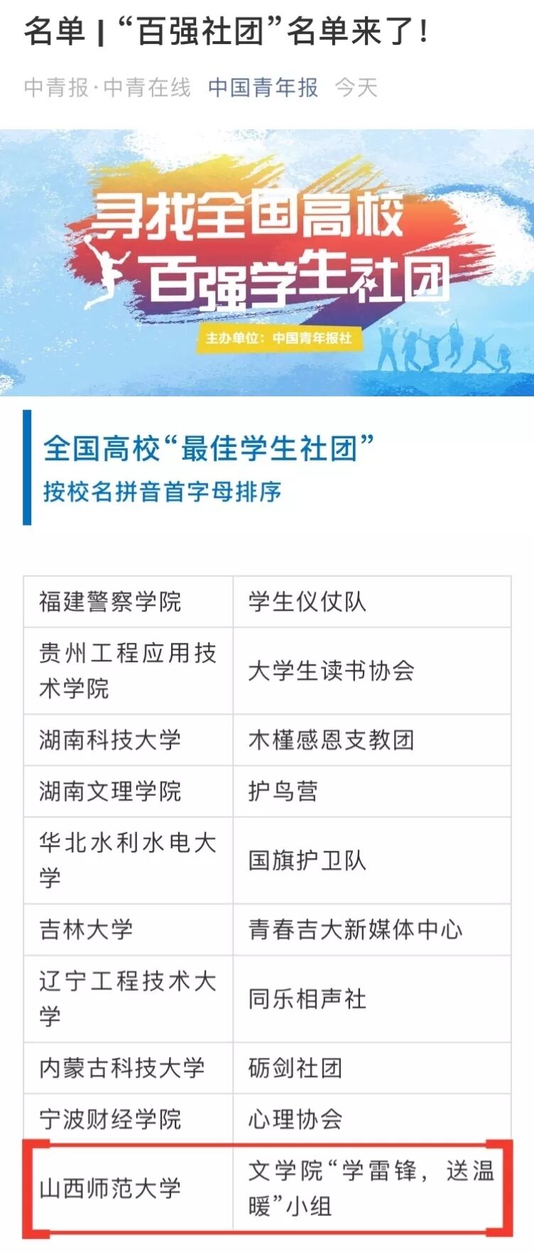 据悉,“寻找全国高校百强学生社团”是中国青年报社为贯彻落实《学联学生会组织改革方案》要求,深入实施《高校学生社团管理暂行办法》而开展的一项活动,两年来,约有4500个社团参加了评选。我校高度重视此项活动,自2018年12月活动启动以来,校团委组织各社团踊跃报名参加,经过认真、细致的筛选,决定推荐“学雷锋,送温暖”小组参加全国评选,最终取得了优异的成绩。