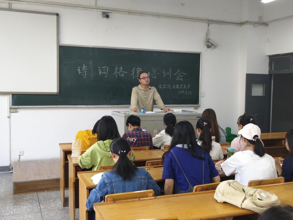 9月28日上午,新葡萄88805官网在12206教室举办了诗词格律讲座,特邀鲁立智老师担任主讲,近50名同学参加了本次活动。