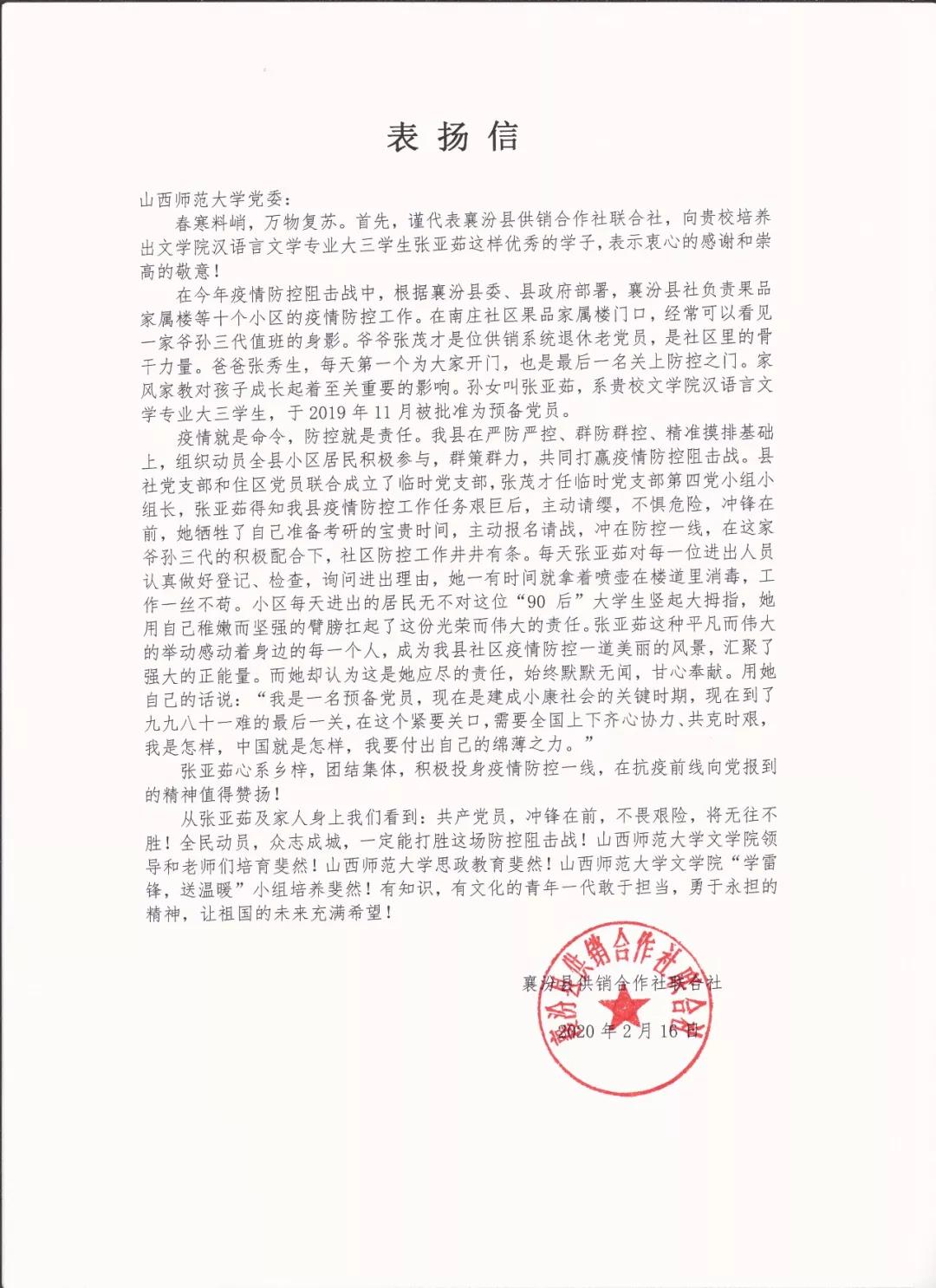 张亚茹从就小受到了良好的家庭影响。她的祖父是一名退休老党员,是社区工作的骨干,还担任了疫情防控期间临时党支部第四党小组组长;父亲每天坚持第一个为大家打开小区大门,也是最后一个关上防控之门。他们祖孙三代上阵防疫的事迹感动了身边的每一位居民和社区防疫责任单位的工作人员,襄汾县人民政府网站以《有多大担当,才能干多大事业》为题报道了他们的事迹,县供销合作社联合社特地向我校发来了表扬信。