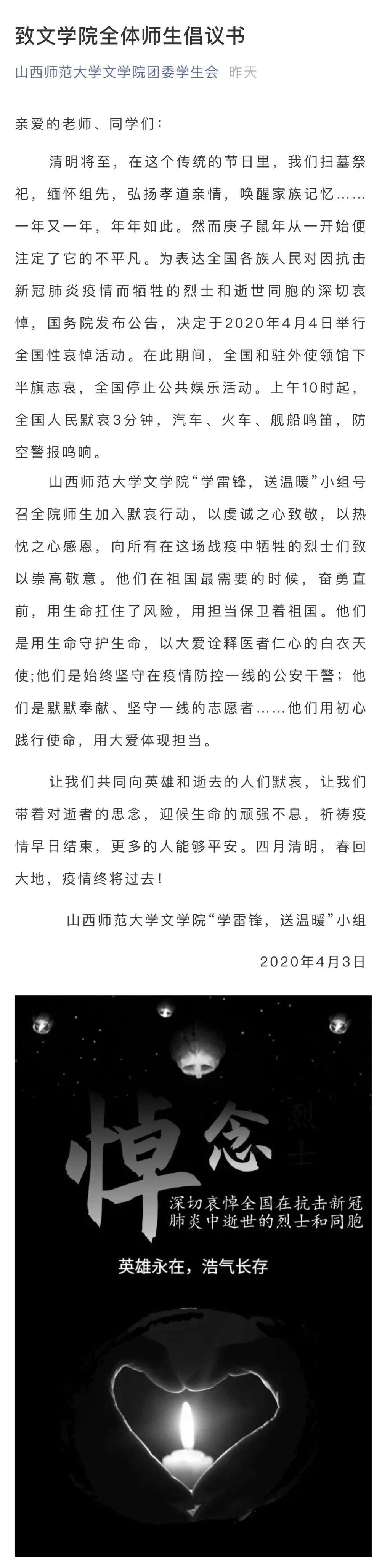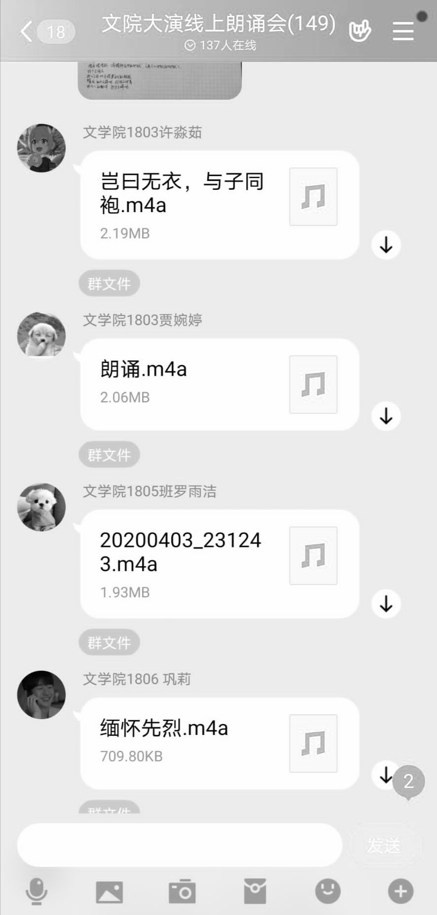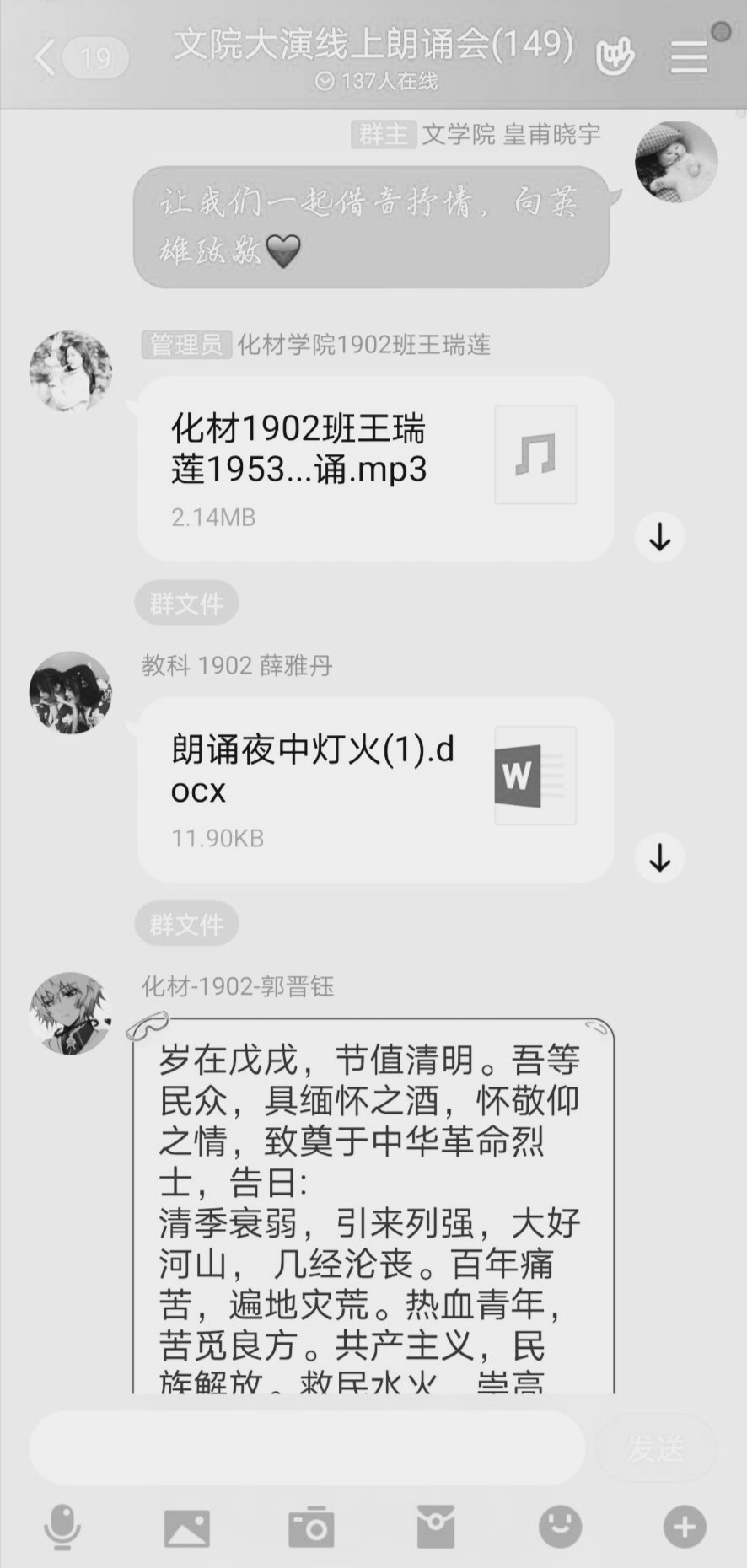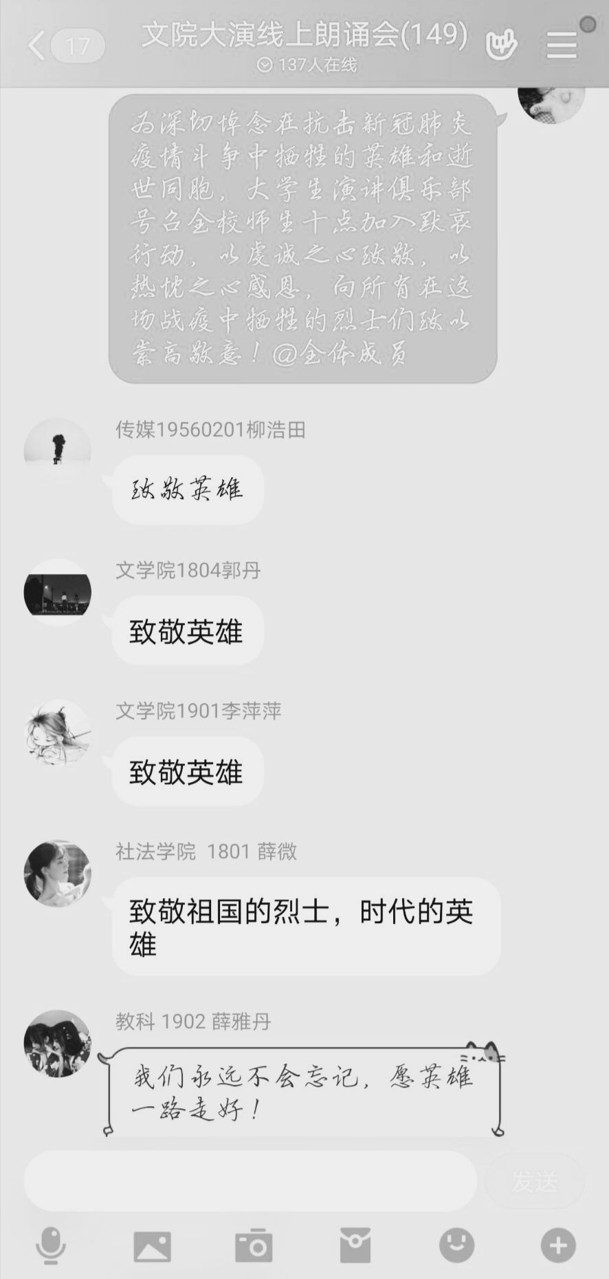 在新葡萄88805官网党委和小组的倡议下,上午10时整,全体同学在家立正默哀,为因抗击新型冠状病毒肺炎而牺牲的烈士及逝世同胞哀悼,向英雄们致以崇高敬意与美好祝愿。随后,小组与大学生演讲俱乐部联合开展的线上朗诵会正式开始,同学们纷纷在活动群上传自己的朗诵音频,借音抒情,在这特殊的节日为战疫英雄们送去最朴素的赞礼。